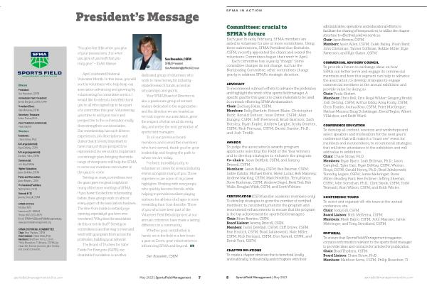 Each year in early February , SFMA members are asked to volunteer for one or more committees . Using these submissions , SFMA President Sun Roesslein , CSFM , recently appointed the chairs and seated the volunteers . Committees began their work in April .