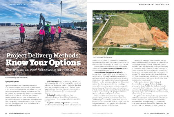 Various builders have preferences regarding project delivery methods , and for various reasons . Todd Penley of GeoSurfaces , for example , explained the various scenarios that make both design / build and design / bid / build the most popular methods on the market when it comes to athletic fields .