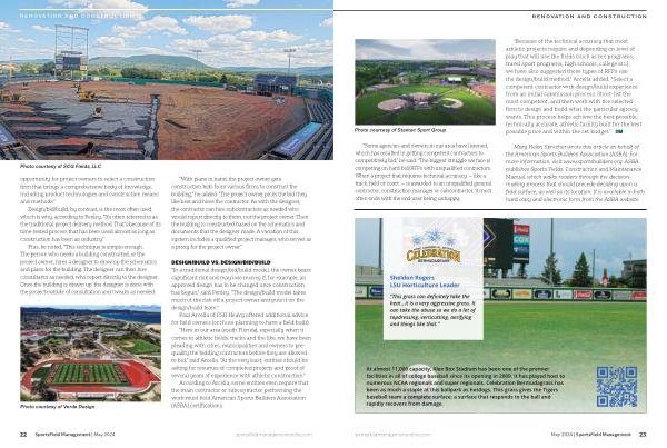“ Because of the technical accuracy that most athletic projects require and depending on level of play that will use the fields ( such as rec programs , travel sport programs , high schools , college etc .), we have also suggested these types of RFPs use the design / build method ,” Arcella added . “ Select a competent contractor with design / build experience from an initial submission process . Short-list the most competent , and then work with the selected firm to design and build what the particular agency wants . This process helps achieve the best possible , technically accurate , athletic facility built for the best possible price and within the set budget .” SFM
