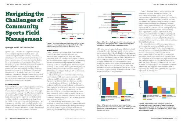 Figure 3 shows participants ’ opinions on potential solutions to overcome the biggest challenges . For participants managing the natural turfgrass fields , approximately 55 % believed that having more money for resources and implementing field reconstruction could help address the biggest challenge in managing natural turfgrass fields . Moreover , allocating longer recovery time or having better scheduling was indicated by 42 % of participants as a potential solution . Fewer participants considered the remaining options , such as receiving more support ( 25 %), adopting synthetic turf ( 18 %), providing more information to justify needs ( 16 %) and other solutions — such as having more fields ( 3 %) — as potential solutions . Approximately 2 % of participants indicated that they perceived no viable solution to address the identified challenge .