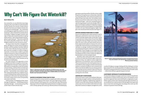 A DIFFERENT APPROACH TO WINTER RESEARCH It’ s clear that turfgrass managers need more research-based tools and solutions to reduce winter injury risk, so we needed to come up with an approach that wasn’ t restricted to a single place or year. Within a given winter, there will always be damage somewhere; so we wondered if we could somehow track damage across space and time to learn how and why grass was dying, then come up with solutions to prevent winter damage. sportsfieldmanagementonline. com May 2025 | SportsField Management