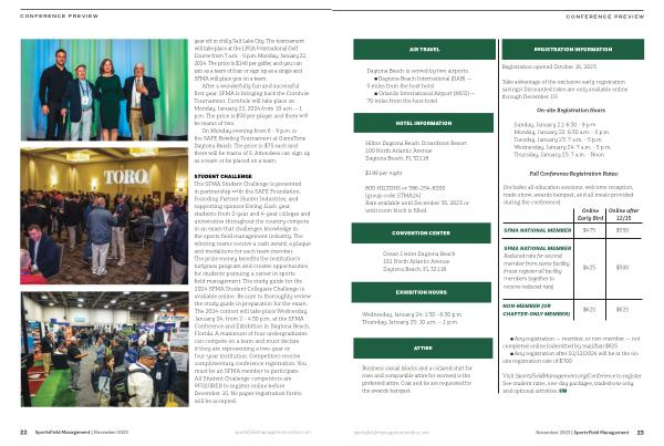 Visit SportsFieldManagement . org / Conference to register . See student rates , one-day packages , tradeshow-only , and optional activities . SFM sportsfieldmanagementonline . com November 2023 | SportsField Management
