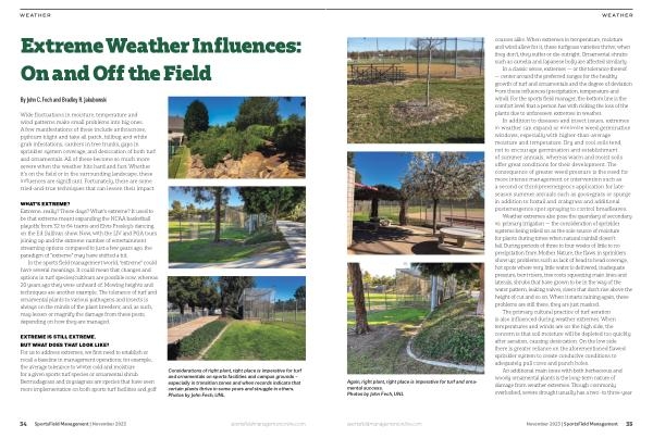 An additional main issue with both herbaceous and woody ornamental plants is the long-term nature of damage from weather extremes . Though commonly overlooked , severe drought usually has a two- to three-year sportsfieldmanagementonline . com November 2023 | SportsField Management