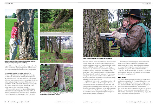HOW TO DETERMINE HOW EXTENSIVE IT IS Once an inspection and monitoring routine is set up , it ’ s important to implement some key techniques for decay detection . The most basic and often most helpful technique is simply probing with a screwdriver . As simple as it sounds , pushing a standard or Phillips screwdriver against any area that looks soft or punky and seeing how far it can be pushed into the bark or sapwood is very telling in terms of whether decay is present .