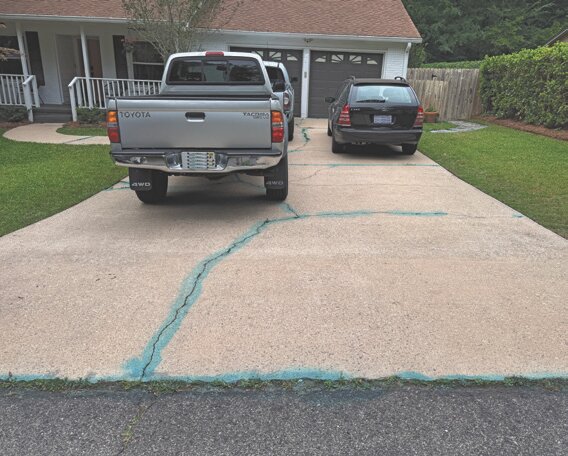 The blue areas on this cement driveway were the result of a lawn maintenance company’s attempt at spot weed control. As all of us know, tracker dye is a non-hazardous indicator dye added to spray tank mixes to properly identify areas covered with the application spray. This improves accuracy and aids in the ability to see areas treated with chemicals like this Glyphosate application. Most quality tracker dyes, when applied to turfgrass areas, will not stain long term, and the temporary color usually disappears with rain, irrigation or sunlight. However, as in this instance, when tracker dyes come onto contact with concrete, they can leave permanent or long-lasting stains. If tracker dye gets on concrete, the best course of action is to try and rinse it immediately with water or use a strong cleaning agent such as a sodium hypochlorite (bleach) solution. Common sense should be used when spraying weeds in cement areas like these driveway cracks. After application, this tracker dye was allowed to dry thoroughly and was visible on this driveway for a couple weeks. The only good thing you can say about this was that he had pretty good coverage.