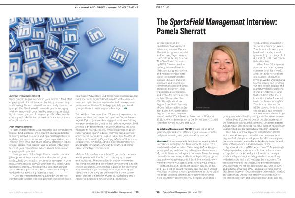 In this edition of The SportsField Management Interview , we meet Pamela Sherratt , turfgrass specialist and lecturer , Department of Horticulture & Crop Science , The Ohio State University ( OSU ). Sherratt teaches undergraduate classes in plant and turfgrass science , and manages online certificates for industry professionals . She also develops seminars and workshops for turf managers and youth groups in the green industry , speaks at conferences , and writes for several media outlets . She received her BSc ( Hons ) horticulture degree from the University of Central Lancashire in England , and her MS turfgrass degree from OSU . Sherratt served on the STMA Board of Directors in 2010 and 2011 , and was the recipient of the Dr . William H . Daniel Founders Award in 2003 and 2018 .