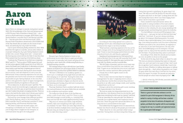 “ Aaron is a great turf mind who continues to set the standard for sports field management in Kentucky . He has worked in a variety of settings and has been a standout everywhere he has been . He welcomes all viewpoints and opinions , and blends that together with his own knowledge to forge his own way in a scientific and regimented manner . He is a great sports field manager .” sportsfieldmanagementonline . com October 2023 | SportsField Management