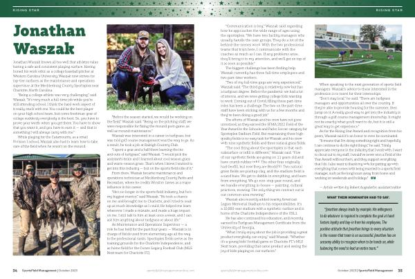 “ Jonathan always leads by example . His willingness to do whatever is required to complete the goal at hand fosters loyalty and buy-in from his employees . The positive attitude that Jonathan brings to every situation is the reason that team is so successful . Jonathan has an uncanny ability to recognize when to be hands on , while balancing the need to lead an entire team .” sportsfieldmanagementonline . com October 2023 | SportsField Management