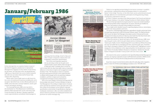 The January / February 1986 cover was tied to the lead feature on “ The Maintenance Link Between Athletic Fields and Golf Turf .” In the cover story , Golf Course Architect Dr . Michael J . Hurdzan urged golf course superintendents and athletic field managers to exchange their knowledge of turf to help each other conquer compaction , intense wear and inadequate construction specifications .