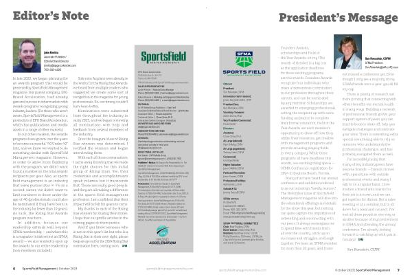 Sun Roesslein , CSFM SFMA President Sun . Roesslein @ jeffco . k12 . co . us sportsfieldmanagementonline . com October 2023 | SportsField Management