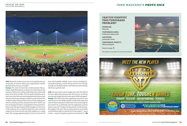 If you would like to submit a photograph for John Mascaro’s Photo Quiz, please send a high-resolution digital photo to John Mascaro via email at john@turf-tec.com. If your photograph is selected, you will receive full credit. All photos submitted will become property of SportsField Management magazine and the Sports Field Management Association.