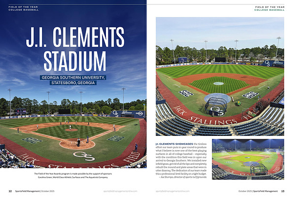 J. I. CLEMENTS SHOWCASES the tireless effort our team puts in year round to produce what I believe is now one of the best playing surfaces in all of college baseball – especially with the condition this field was in upon our arrival to Georgia Southern. We installed new infield grass, got rid of all the lips and completely rebuilt the mound and plate areas that were in utter disarray. The dedication of our team made this a professional-level facility on a tight budget.