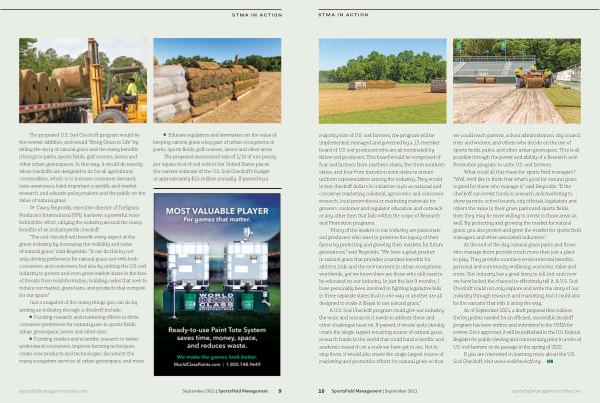 What could all this mean for sports field managers ? “ Well , we ’ d like to think that what ’ s good for natural grass is good for those who manage it ,” said Reynolds . “ If the checkoff can invest funds in research and marketing to show parents , school boards , city officials , legislators and others the value in their grass parks and sports fields , then they may be more willing to invest in those areas as well . By protecting and growing the market for natural grass , you also protect and grow the market for sports field managers and other associated industries .”
