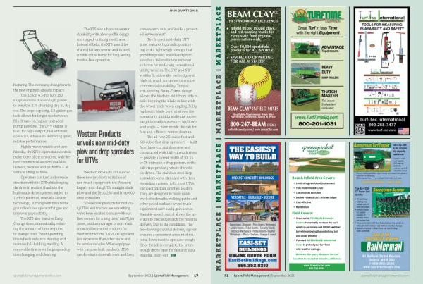 The all-new 2.5-cubic-foot and 6.0-cubic-foot drop spreaders — built from laser-cut stainless steel and constructed with high-strength rivets — provide a spread width of 30 , 33 or 36 inches in a drop pattern , so the salt stays precisely where the vehicle drives . The stainless-steel drop spreaders come standard with three mounting systems to fit most UTVs , compact tractors , or wheel loaders . They are designed to make quick work of sidewalks , walking paths and other paved surfaces where truck equipment can ’ t easily gain access . Variable-speed control allows the operator to precisely match the material delivery rate to the conditions . The free-flowing material delivery system ensures a consistent amount of material flows into the spreader trough . Once the job is complete , the entire trough drops open for fast and easy material clean-out . SFM sportsfieldmanagementonline . com September 2021 | SportsField Management