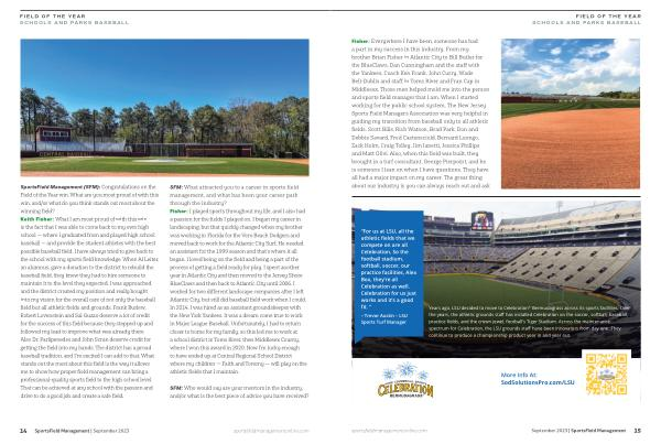 SportsField Management ( SFM ): Congratulations on the Field of the Year win . What are you most proud of with this win , and / or what do you think stands out most about the winning field ? Keith Fisher : What I am most proud of with this win is the fact that I was able to come back to my own high school — where I graduated from and played high school baseball — and provide the student athletes with the best possible baseball field . I have always tried to give back to the school with my sports field knowledge . When Al Leiter , an alumnus , gave a donation to the district to rebuild the baseball field , they knew they had to hire someone to maintain it to the level they expected . I was approached , and the district created my position and really bought into my vision for the overall care of not only the baseball field but all athletic fields and grounds . Frank Burlew , Robert Lovenstein and Sal Guzzo deserve a lot of credit for the success of this field because they stepped up and followed my lead to improve what was already there . Also Dr . Parlipenedes and John Scran deserve credit for getting the field into my hands . The district has a proud baseball tradition , and I ’ m excited I can add to that . What stands out the most about this field is the way it allows me to show how proper field management can bring a professional-quality sports field to the high school level . That can be achieved at any school with the passion and drive to do a good job and create a safe field .