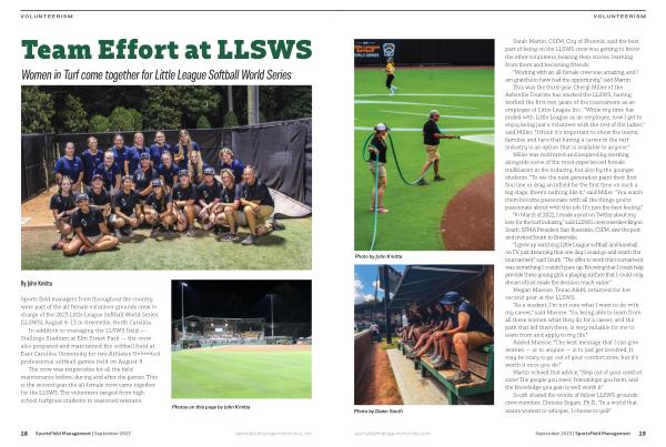 Miller was motivated and inspired by working alongside some of the most experienced female trailblazers in the industry , but also by the younger students . “ To see the next generation paint their first foul line or drag an infield for the first time on such a big stage , there ’ s nothing like it ,” said Miller . “ You watch them become passionate with all the things you ’ re passionate about with this job . It ’ s just the best feeling .” “ In March of 2022 , I made a post on Twitter about my love for the turf industry ,” said LLSWS crew member Brynn South . SFMA President Sun Roesslein , CSFM , saw the post and invited South to Greenville .