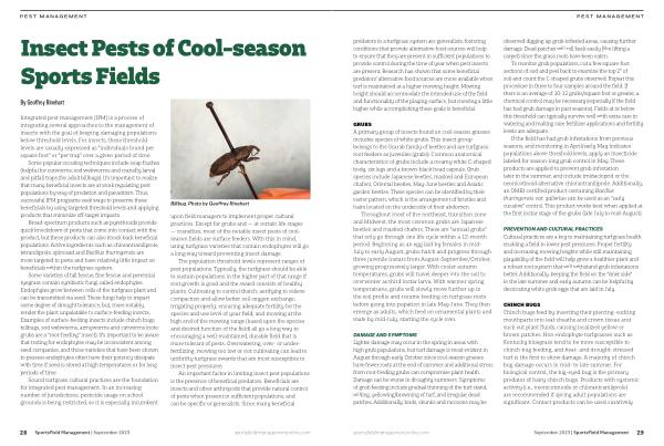 CHINCH BUGS Chinch bugs feed by inserting their piercing-sucking mouthparts into leaf sheaths and crown tissue and suck out plant fluids , causing localized yellow or brown patches . Non-endophyte turfgrasses such as Kentucky bluegrass tend to be more susceptible to chinch bug feeding , and heat- and drought-stressed turf is the first to show damage . A majority of chinch bug damage occurs in mid- to late summer . For biological control , the big-eyed bug is the primary predator of hairy chinch bugs . Products with systemic activity ( i . e ., neonicotinoids or chlorantraniliprole ) are recommended if spring adult populations are significant . Contact products can be used curatively . sportsfieldmanagementonline . com September 2023 | SportsField Management