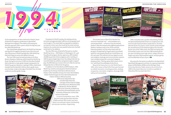 All content for this section is pulled from the SportsTurf / SportsField Management archives , an ongoing cooperative project of EPG Media , SFMA and the Michigan State University Libraries . Public access to the archive from 1985 to the present ( less two months ) is available at https :// sturf . lib . msu . edu / index . html . sportsfieldmanagementonline . com September 2024 | SportsField Management