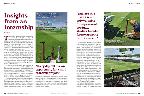 This summer, I had the incredible opportunity to intern with the Kansas City (KC) Current grounds crew as their playing surface data technician. The KC Current is a professional women’s soccer team competing in the National Women’s Soccer League (NWSL), the highest level of professional women’s soccer in the United States. As a former Division I soccer player at Virginia Tech, getting to work with a professional team like this was truly a dream come true.