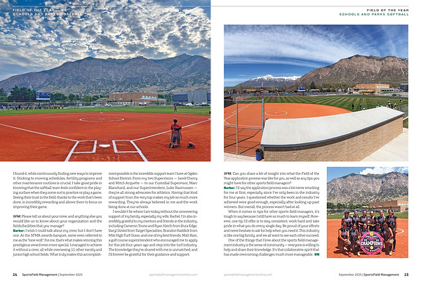 SFM: Please tell us about your crew, and anything else you would like us to know about your organization and the fields / facilities that you manage? Barker: I wish I could talk about my crew, but I don’ t have one. At the SFMA awards banquet, some even referred to me as the“ lone wolf.” For me, that’ s what makes winning this prestigious award even more special. I managed to achieve it without a crew, all while overseeing 11 other varsity and junior high school fields. What truly makes this accomplish- ment possible is the incredible support team I have at Ogden School District. From my two Supervisors— Jared Cherry and Mitch Arquette— to our Custodial Supervisor, Marc Blanchard, and our Superintendent, Luke Rasmussen— they’ re all strong advocates for athletics. Having that kind of support from the very top makes my job so much more rewarding. They’ ve always believed in me and the work being done at our schools.
