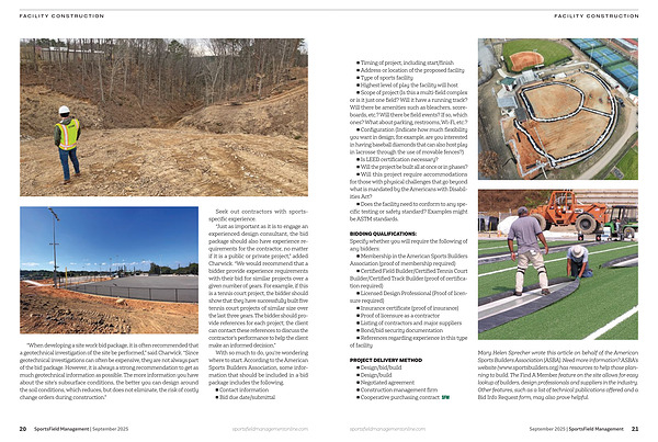 Mary Helen Sprecher wrote this article on behalf of the American Sports Builders Association( ASBA). Need more information? ASBA’ s website( www. sportsbuilders. org) has resources to help those planning to build. The Find A Member feature on the site allows for easy lookup of builders, design professionals and suppliers in the industry. Other features, such as a list of technical publications offered and a Bid Info Request form, may also prove helpful. sportsfieldmanagementonline. com September 2025 | SportsField Management