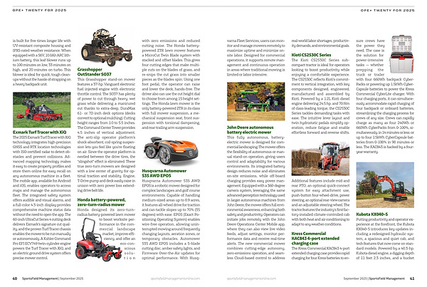 This fully autonomous, batteryelectric mower is designed for commercial landscaping. The mower offers the flexibility of autonomous or manual stand-on operation, giving users control and adaptability for various environments. Its integrated battery design reduces noise and eliminates on-site emissions, while off-board charging provides easy power management. Equipped with a 360-degree camera system, leveraging the same advanced perception technology used in larger autonomous machines from John Deere, the mower offers full environmental awareness, enhancing both safety and productivity. Operators can initiate jobs remotely with the John Deere Operations Center Mobile app, where they can also view live video feeds, adjust settings, monitor performance data and receive real-time alerts. The new commercial mower combines cutting-edge autonomy, zero-emissions operation, and seamless Cloud-based control to address