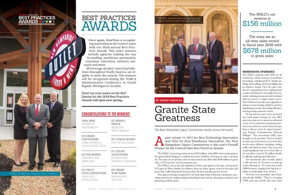 Once again , StateWays is recognizing innovation in the control states with our third-annual Best Practices Awards . This year ’ s winners include agencies leading the way in retailing , warehouse automation , consumer education , industry outreach and more . All beverage alcohol control jurisdictions throughout North America are eligible to enter the awards . The winners will be recognized during the NABCA Administrators Conference in Grand Rapids , Michigan in October .