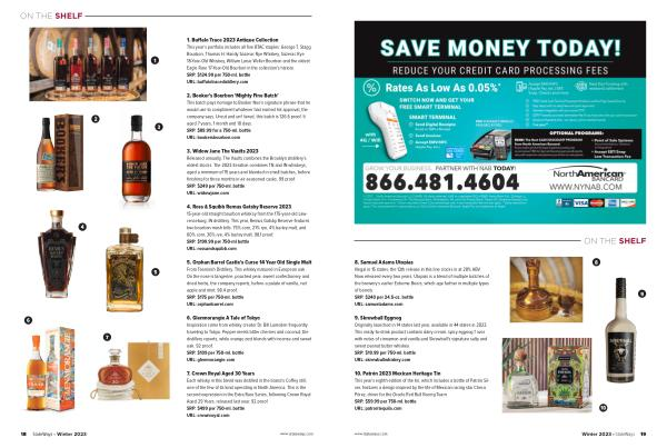 1 . Buffalo Trace 2023 Antique Collection This year ’ s portfolio includes all five BTAC staples : George T . Stagg Bourbon , Thomas H . Handy Sazerac Rye Whiskey , Sazerac Rye 18-Year-Old Whiskey , William Larue Weller Bourbon and the oldest Eagle Rare 17-Year-Old Bourbon in the collection ’ s history . SRP : $ 124.99 per 750-ml . bottle URL : buffalotracedistillery . com