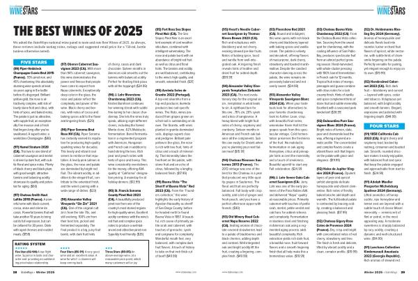 ( 92) Harebrained Cabernet 2023( CA). Rich dark fruit— blackberry and currant— layered with spice, cedar and tobacco. Voluptuous yet balanced, with bright acidity and smooth tannins. Elegant, expressive and polished with lingering depth.($ 44.99)